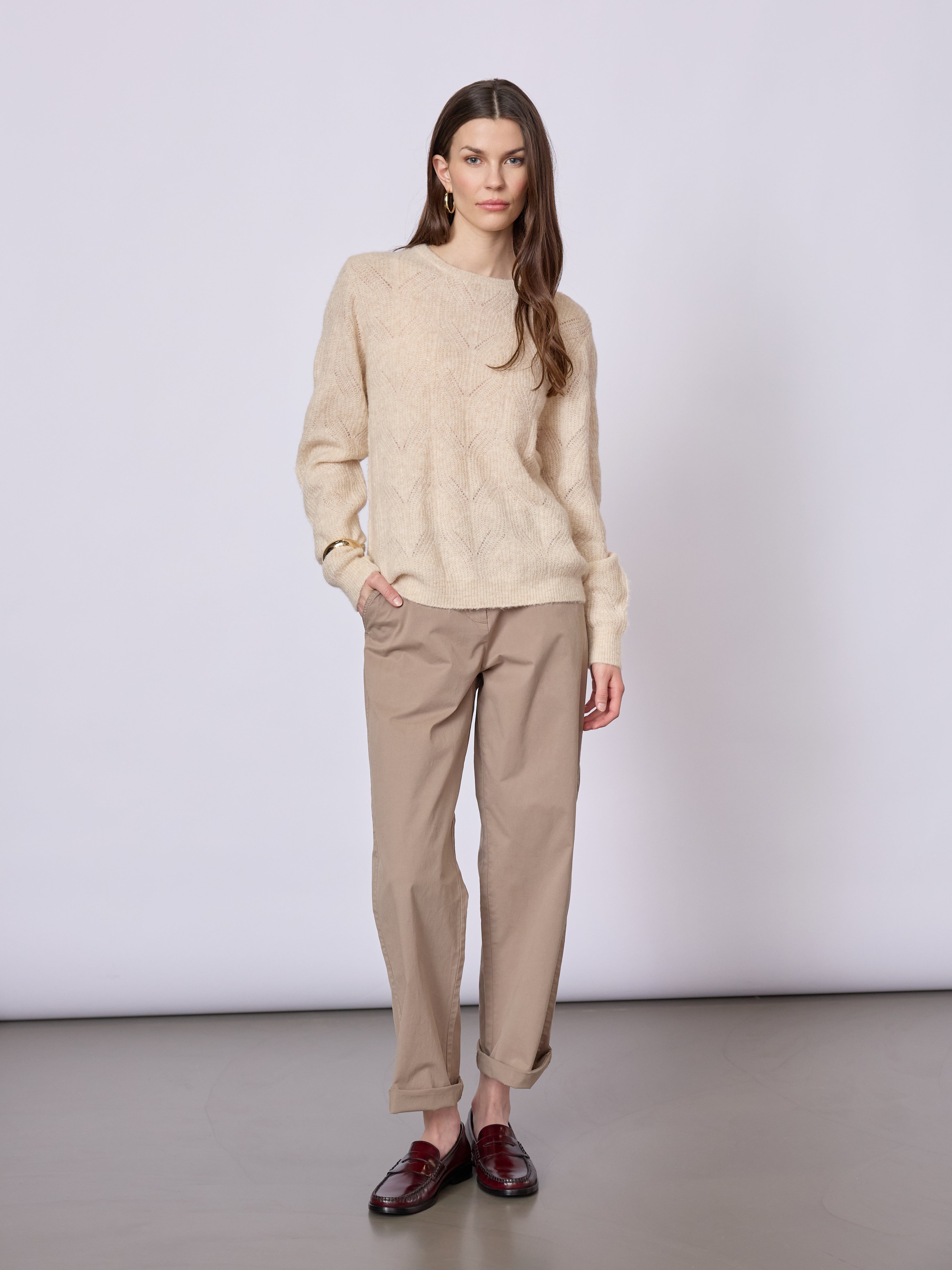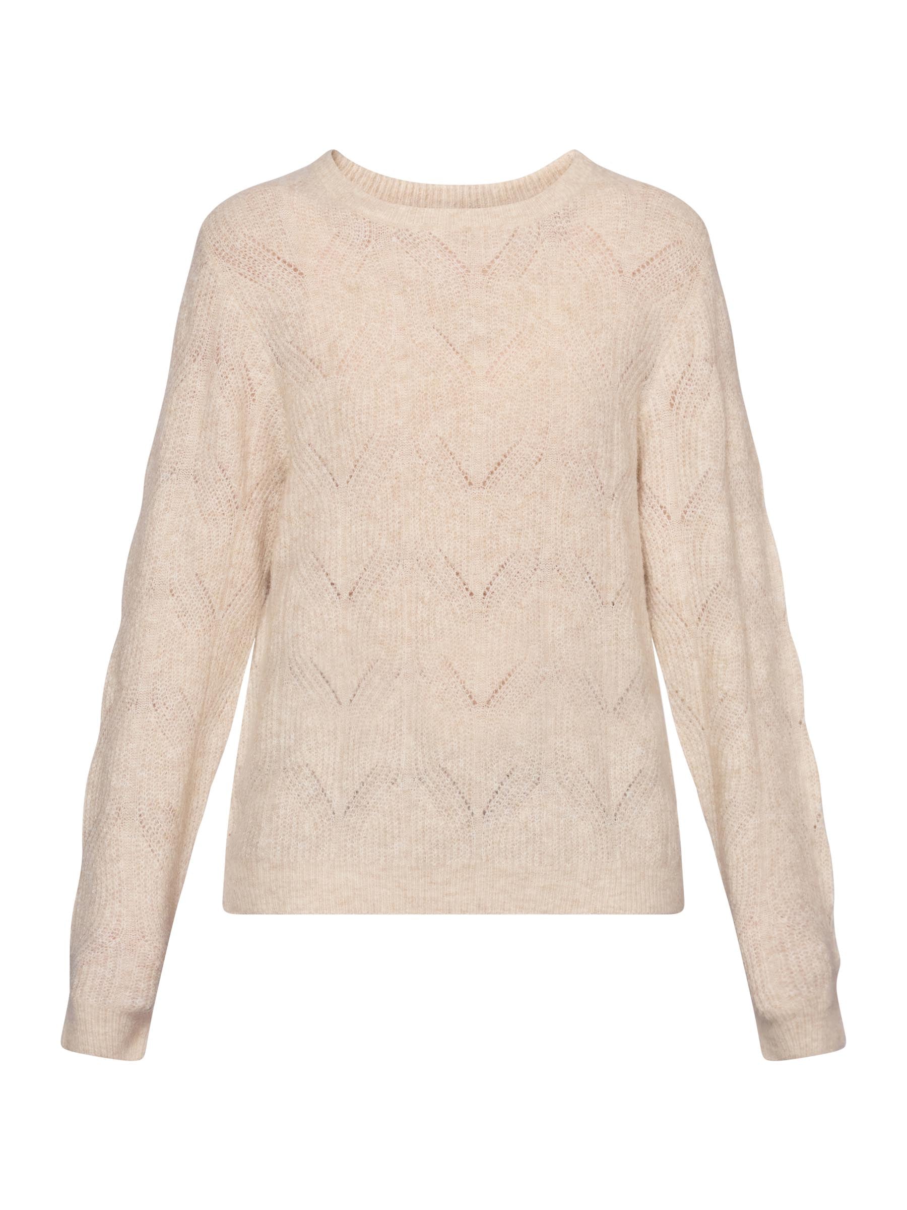 Blød striktrøje i en struktureret blanding med alpaka, der giver varme og en let, luftig fornemmelse. Den afslappede pasform og den klassiske rundhals skaber et tidløst udtryk til køligere dage.