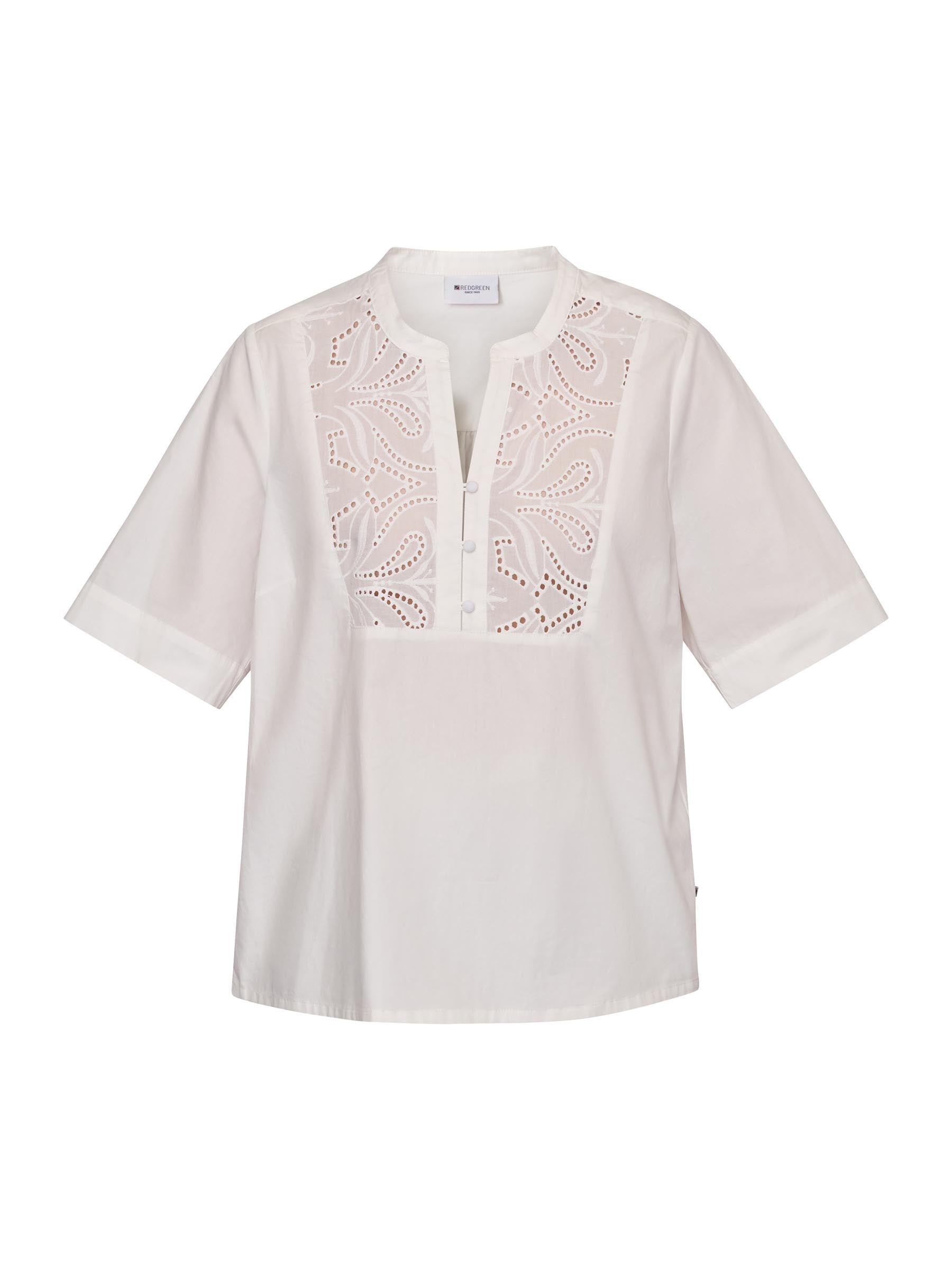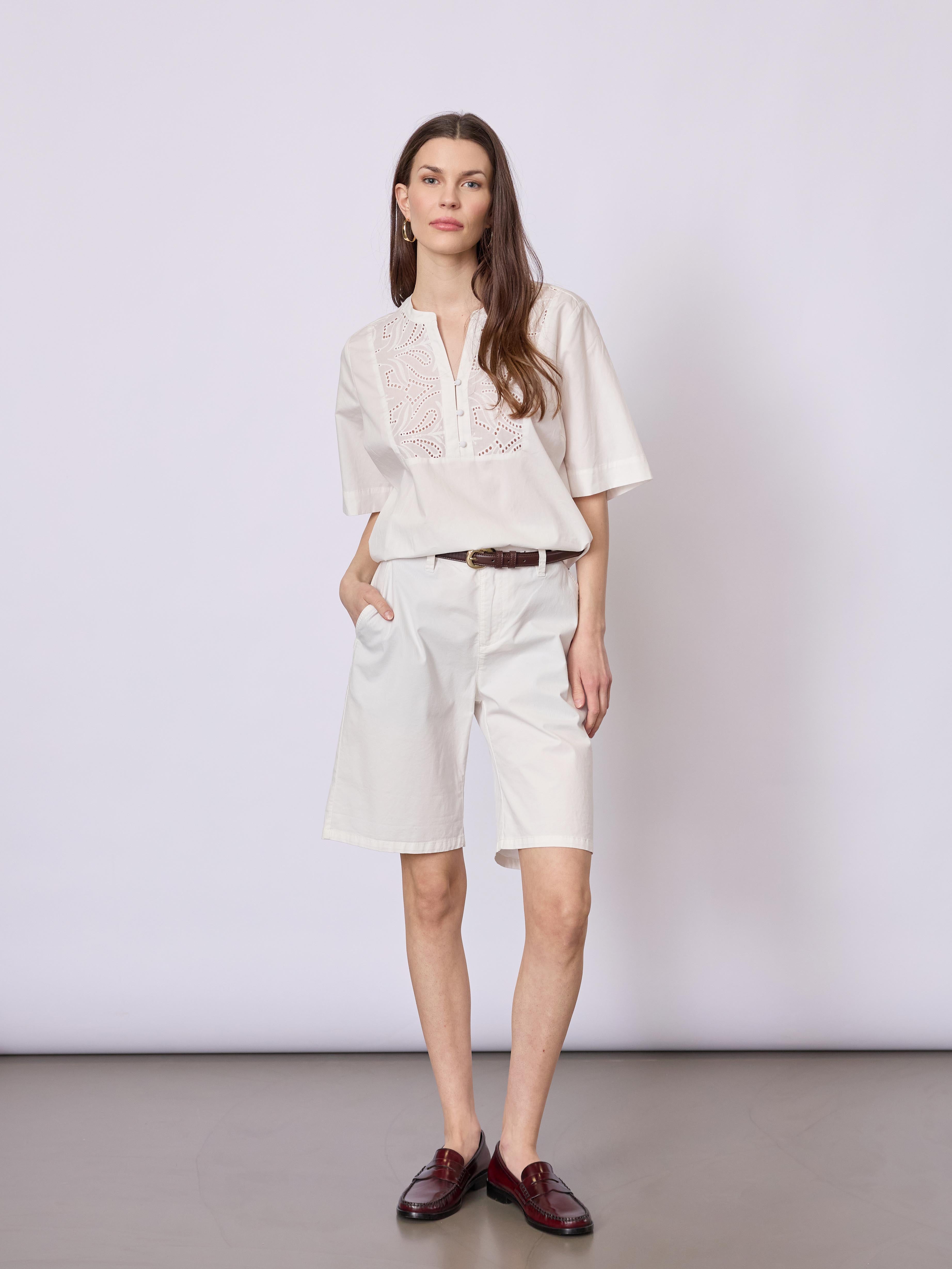 Let og feminin bluse i 100% bomuld med et fint, småmønstret print og et afslappet snit. Blusen har korte ærmer og en diskret V-udskæring, der giver et let og elegant udtryk – ideel til både hverdag og arbejde.