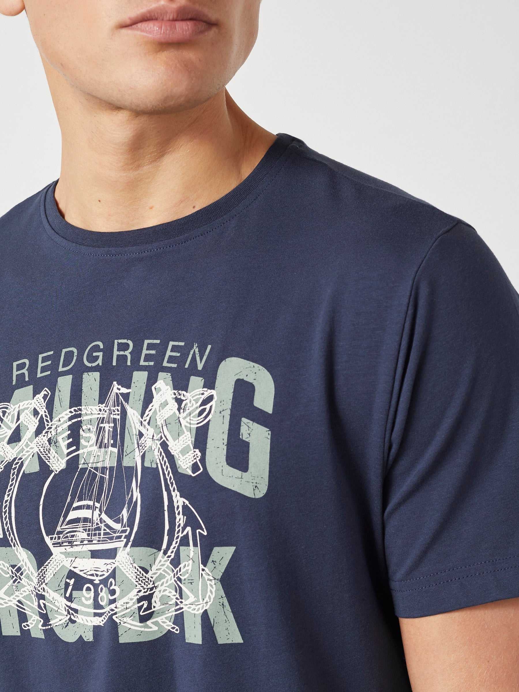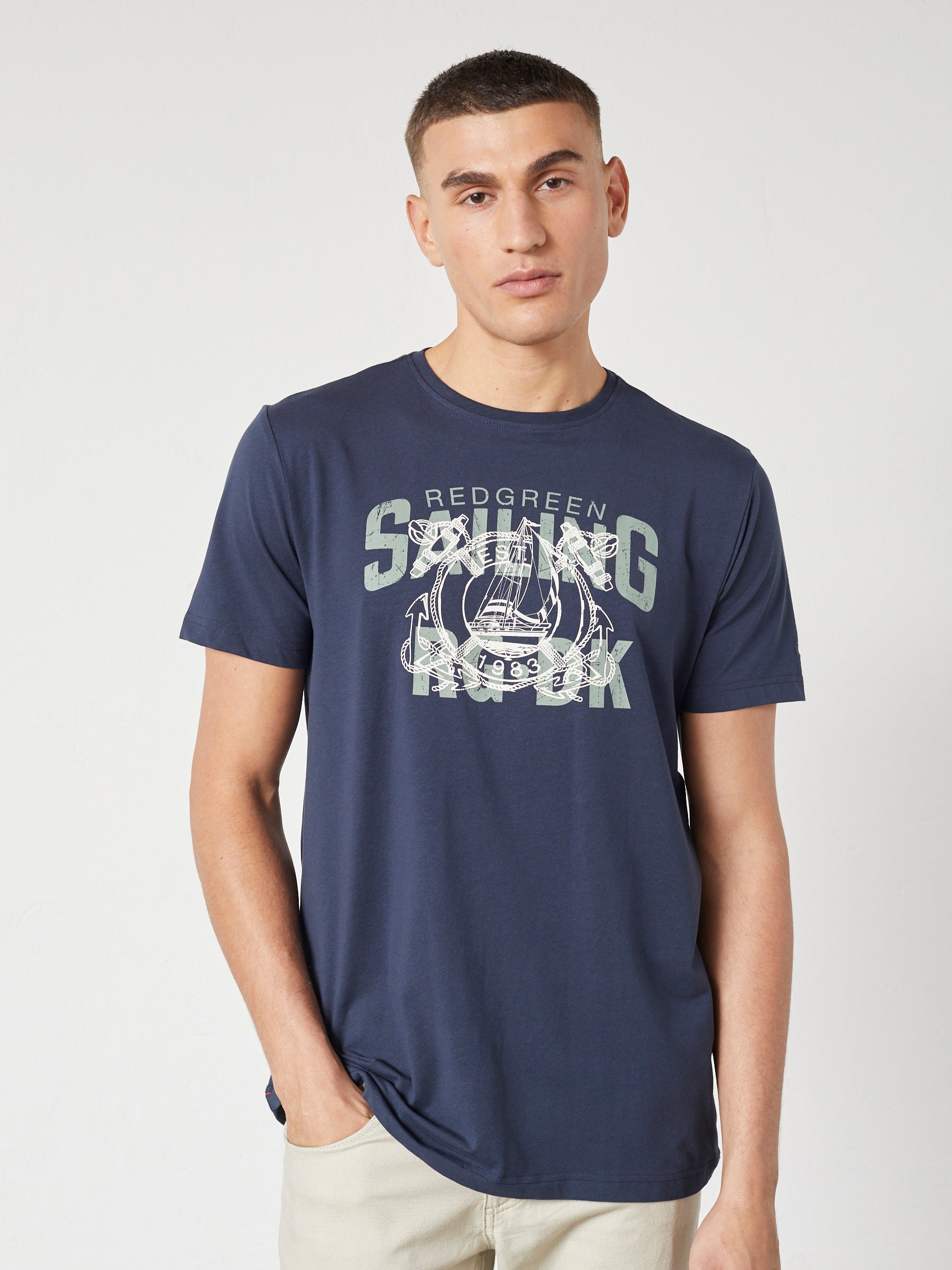 Afslappet herre-T-shirt i blød bomuldsblanding med stræk og et markant grafisk brystprint. Den behagelige kvalitet og fleksible pasform gør T-shirten velegnet til hverdagsbrug og afslappede fritidslooks.