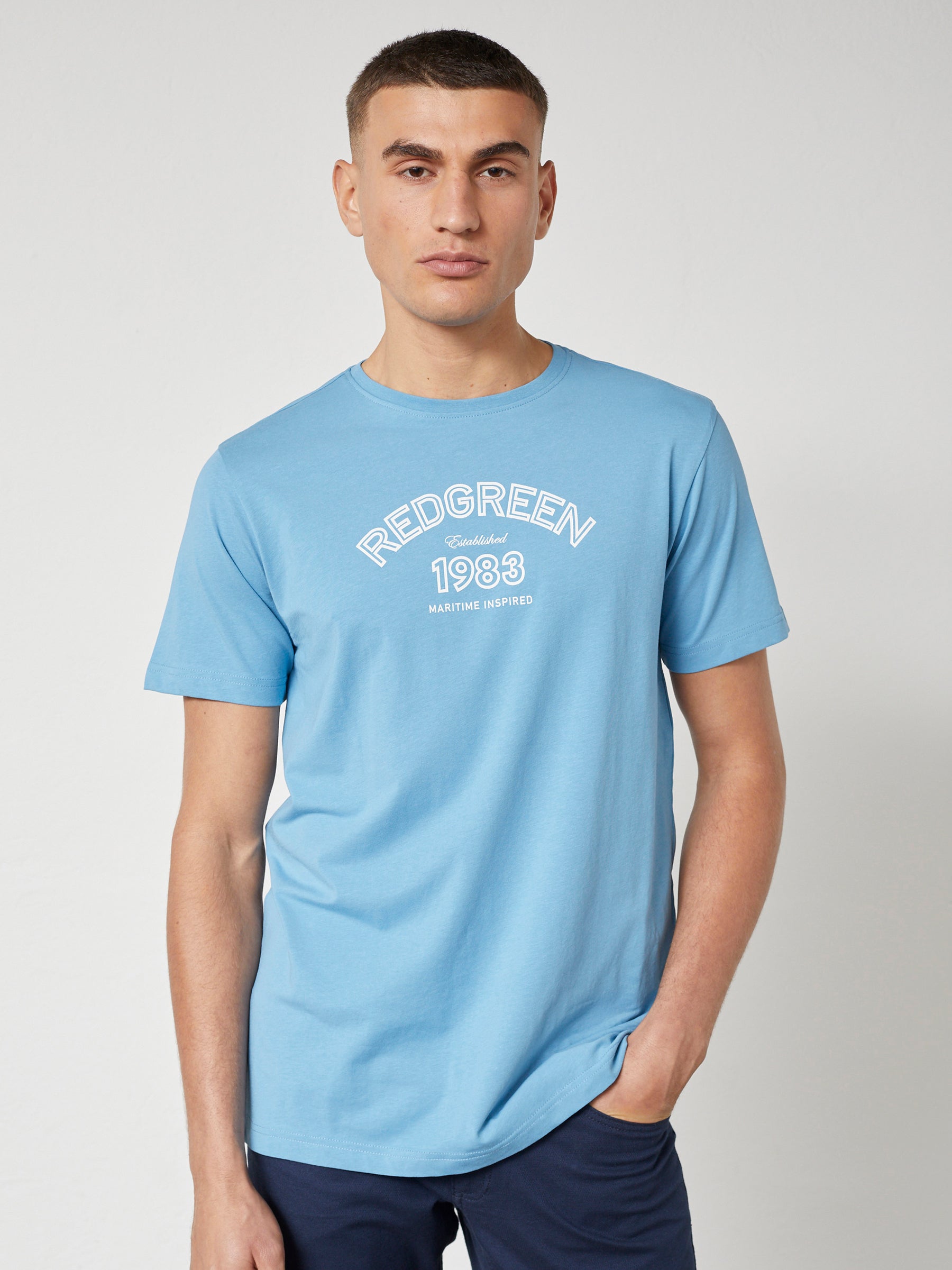 Afslappet herre-T-shirt i blød bomuldsblanding med stræk og et grafisk print på brystet. Den komfortable kvalitet og rene pasform gør T-shirten velegnet til hverdagsbrug og afslappede looks.