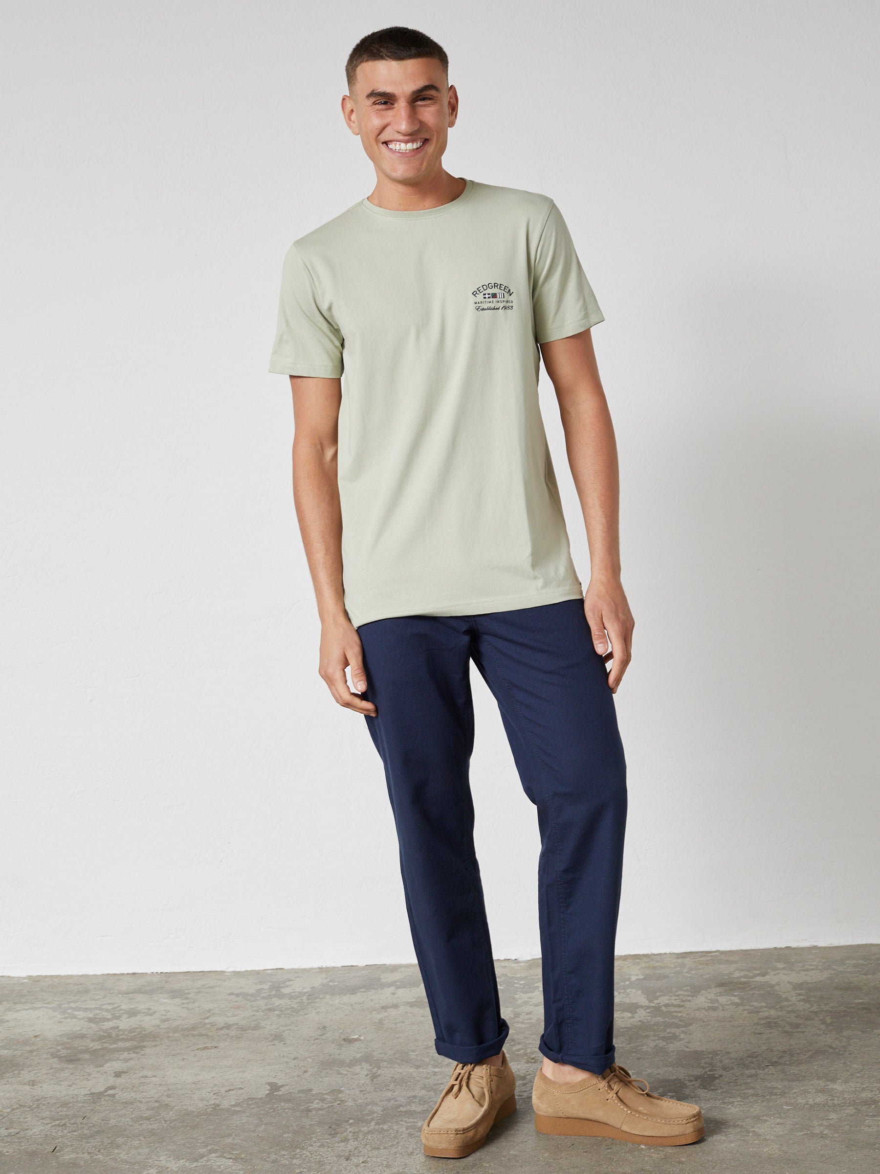 Afslappet herre-T-shirt i blød bomuldsblanding med stræk og et diskret brystprint. Den behagelige kvalitet og fleksible pasform gør T-shirten velegnet til hverdagsbrug og afslappede fritidslooks.