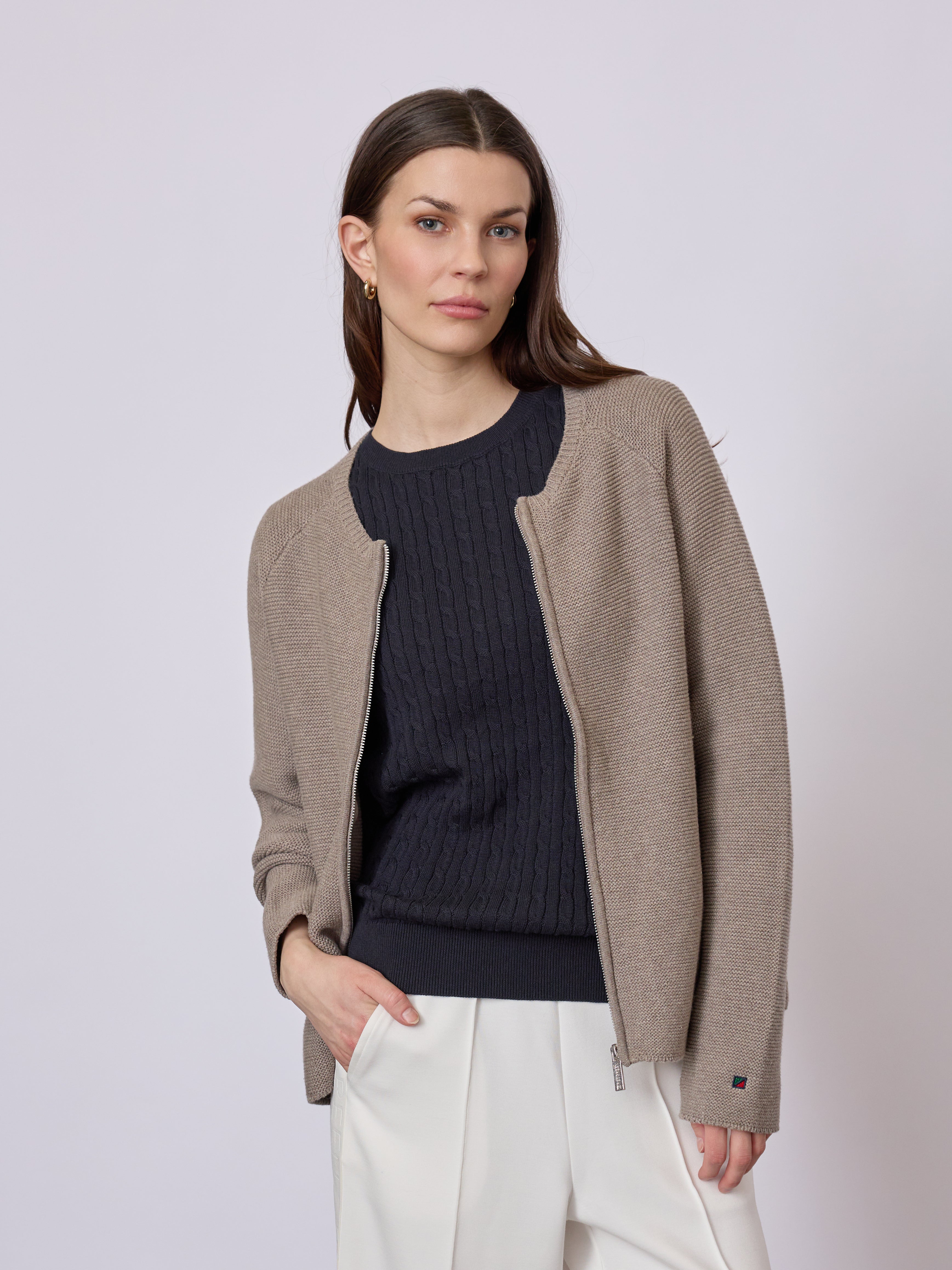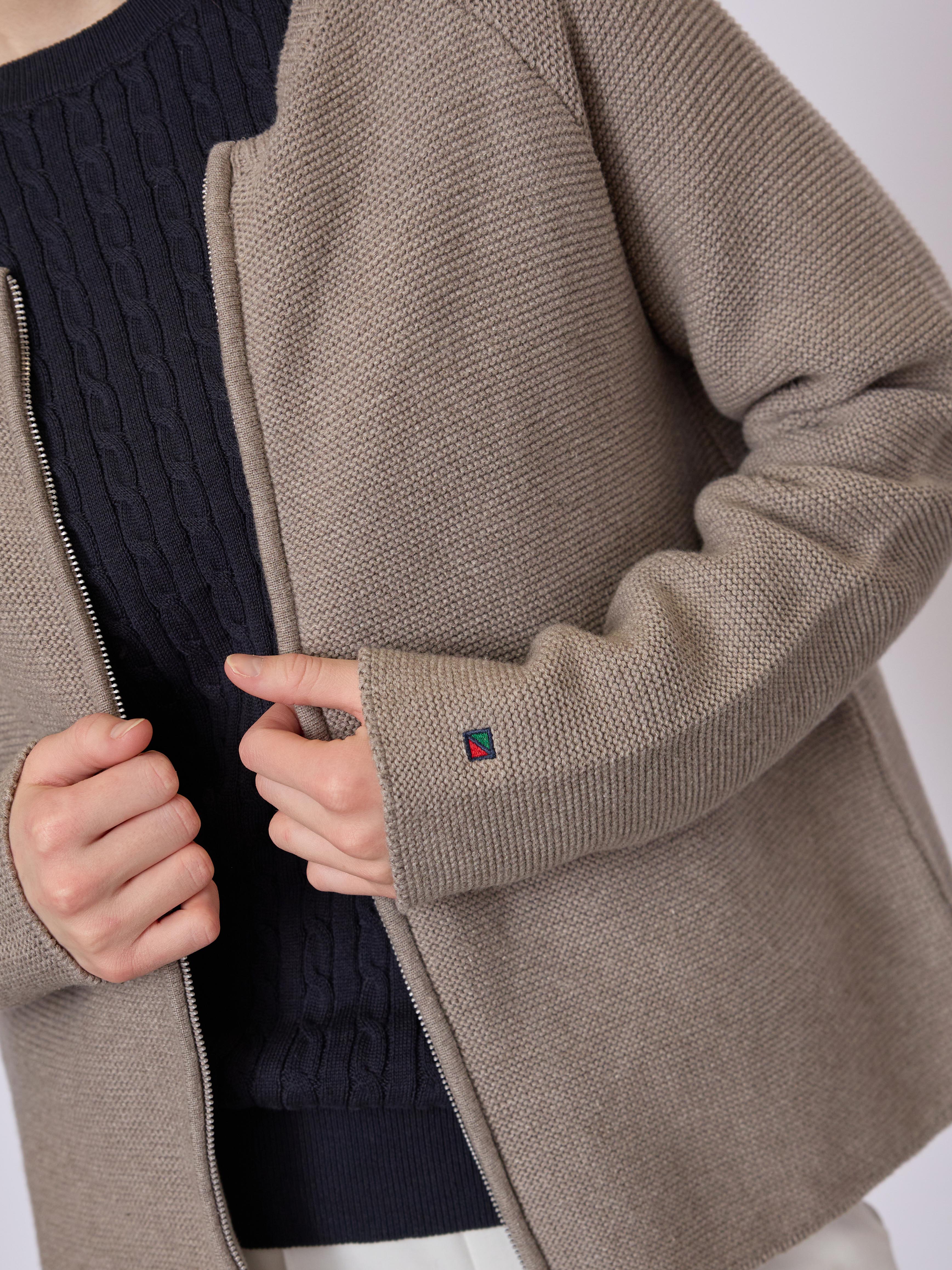Jazz har en afslappet pasform og lynlåslukning foran, hvilket gør den nem at style både åben og lukket – perfekt til hverdagsbrug og lag-på-lag.