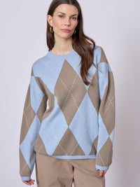 Naja har en tidløs silhuet med et klassisk argyle-mønster og en blød, behagelig kvalitet, der gør den velegnet til både hverdag og afslappede looks. De afdæmpede farver giver et roligt, maritimt udtryk.