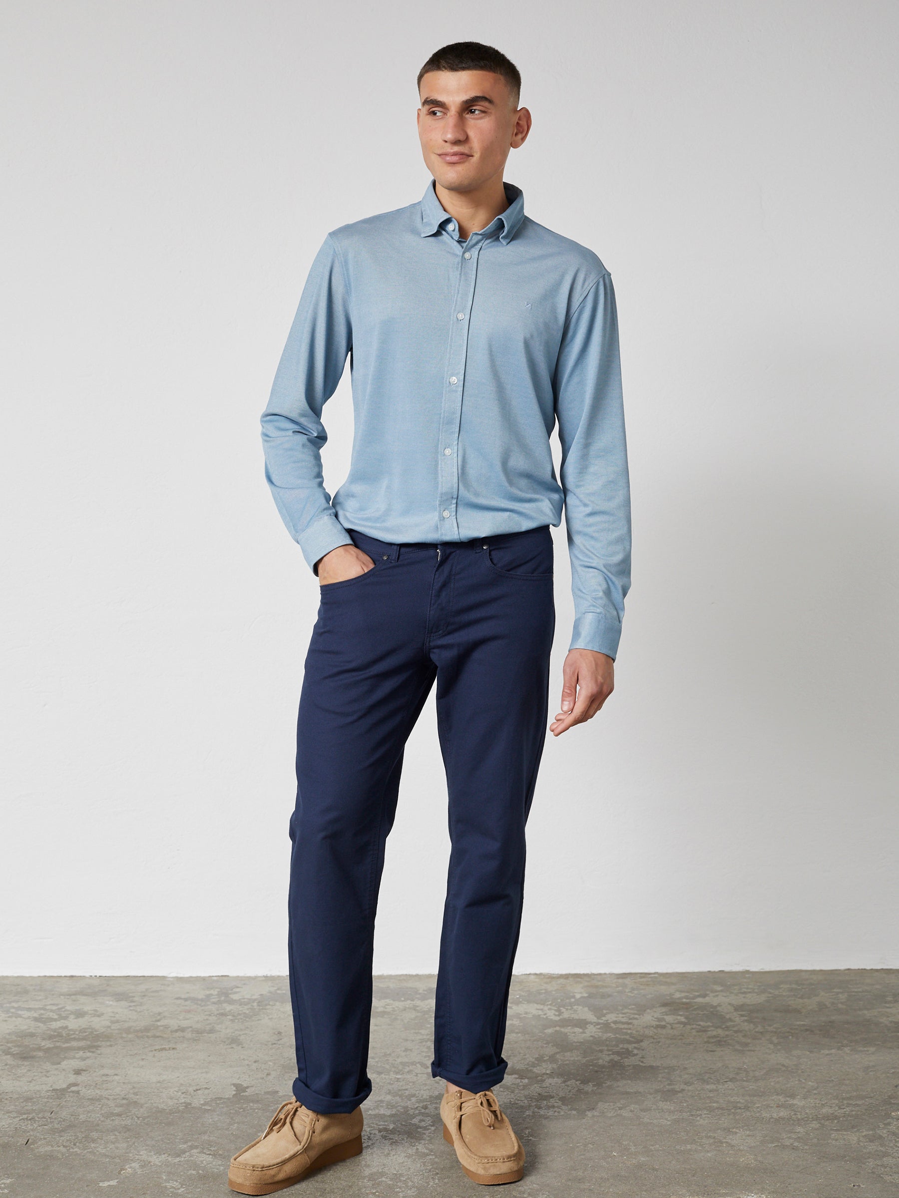 Klassiske herrebukser i bomuldsblanding med let stræk og et rent, tidløst udtryk. Designet til hverdagsbrug med behagelig pasform og god bevægelsesfrihed, der fungerer både afslappet og mere velklædt.