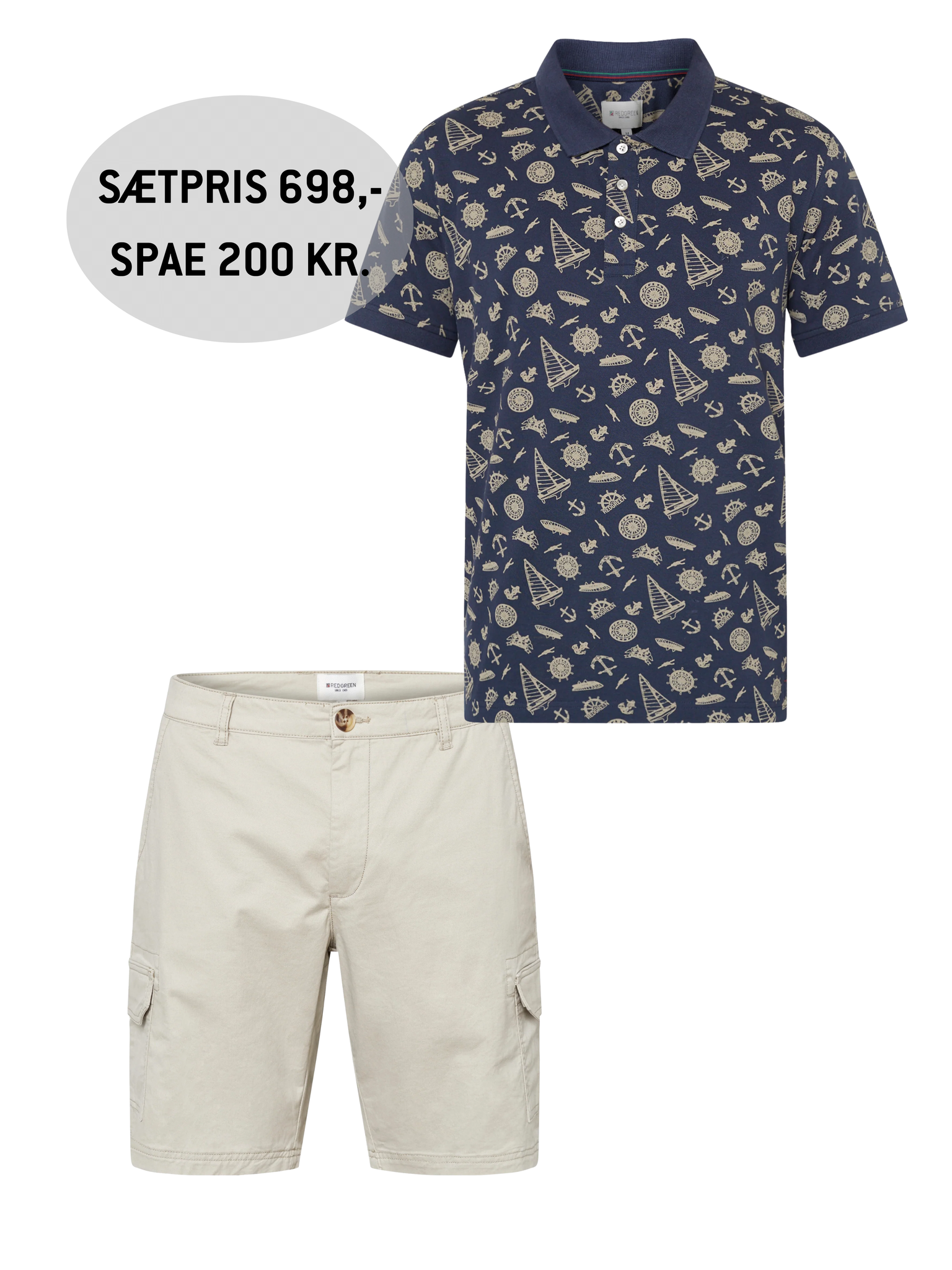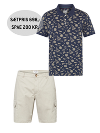 Et afslappet og stilfuldt sommersæt med maritimt udtryk. Den mønstrede polo giver et frisk og karakterfuldt look, mens de klassiske cargo-shorts fuldender outfittet med funktionelle detaljer og komfort.