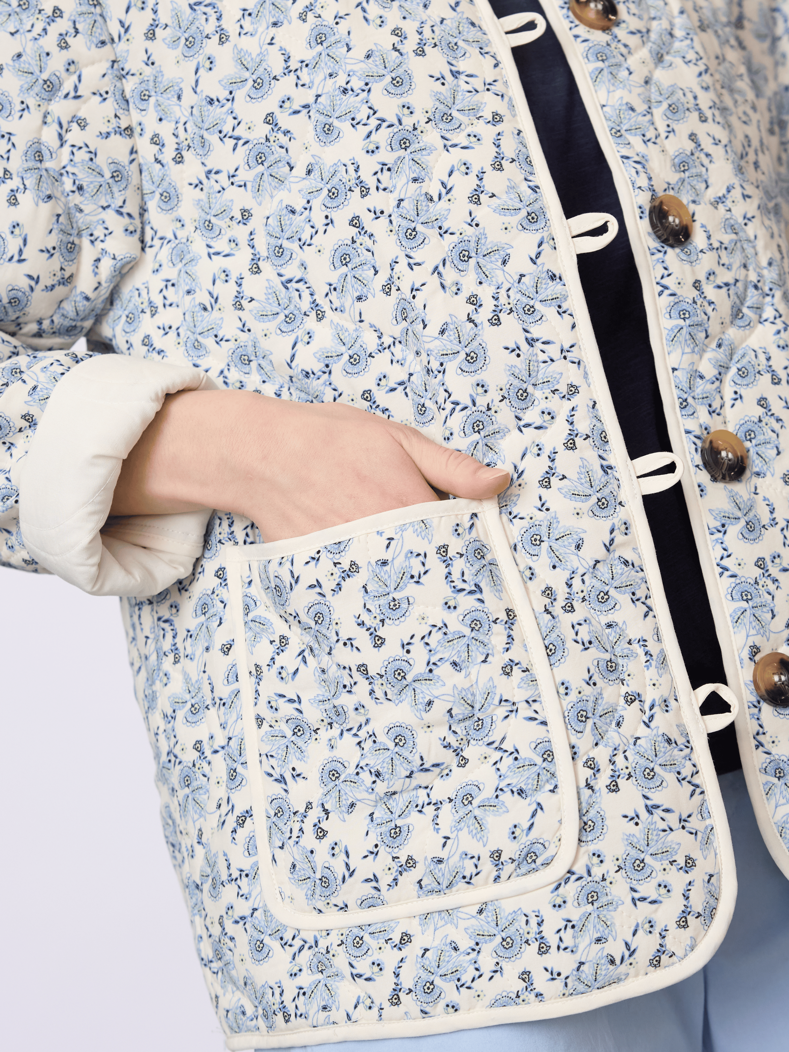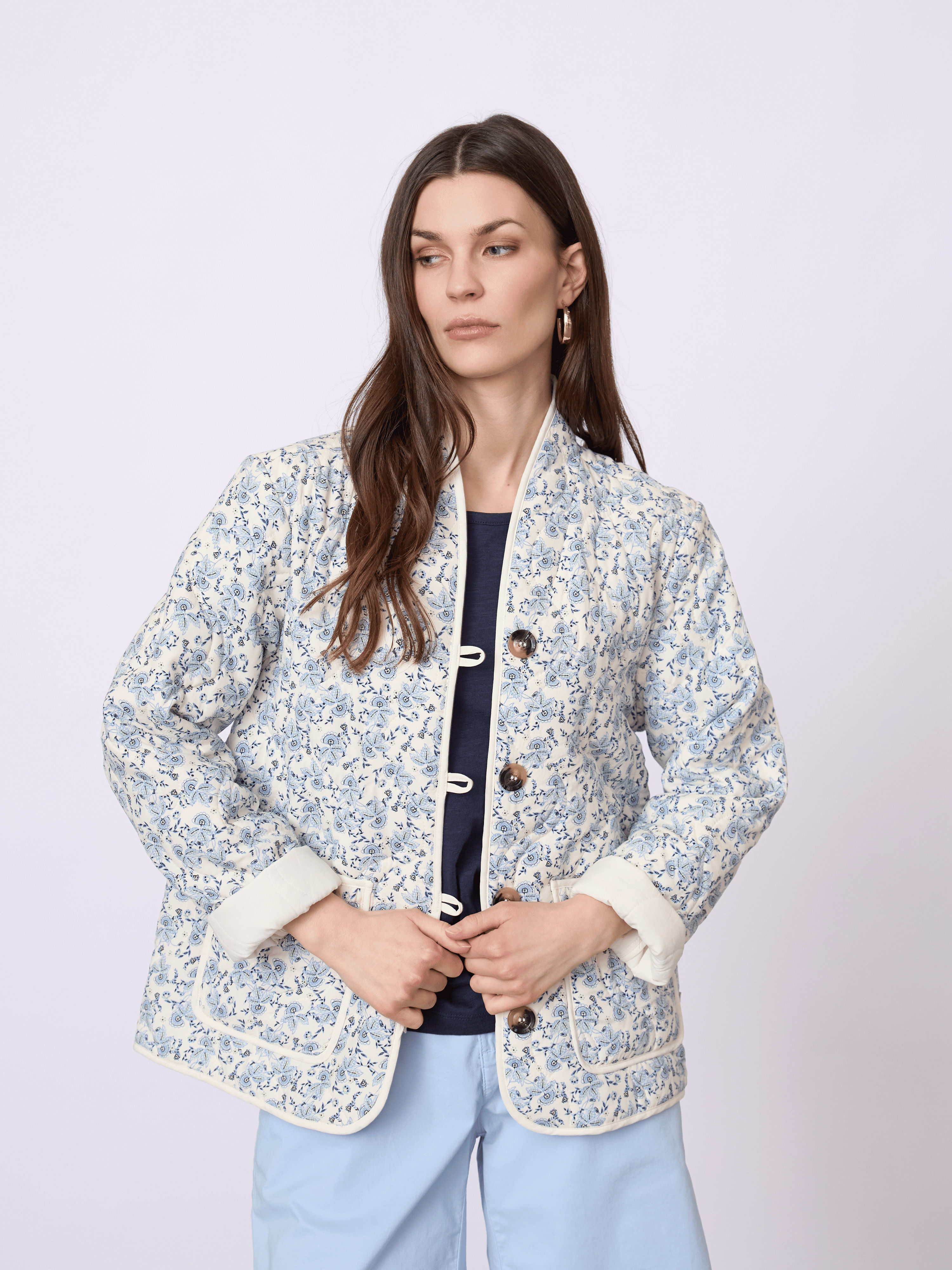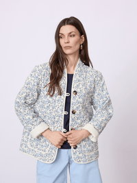 Let og feminin damejakke i 100% viskose med et dekorativt all-over print og et blødt, afslappet udtryk. En komfortabel jakke, der fungerer godt som let lag i overgangsperioder.