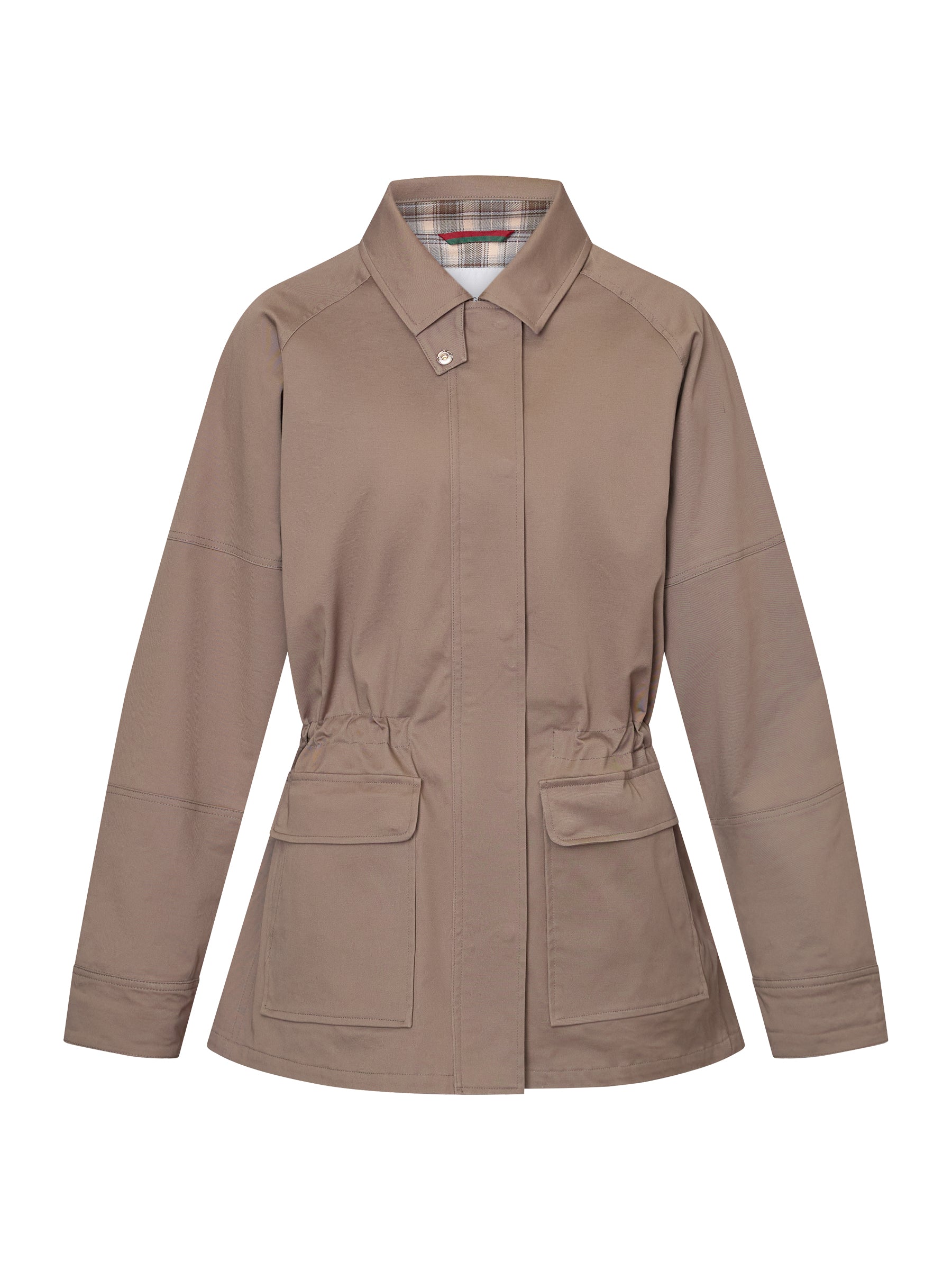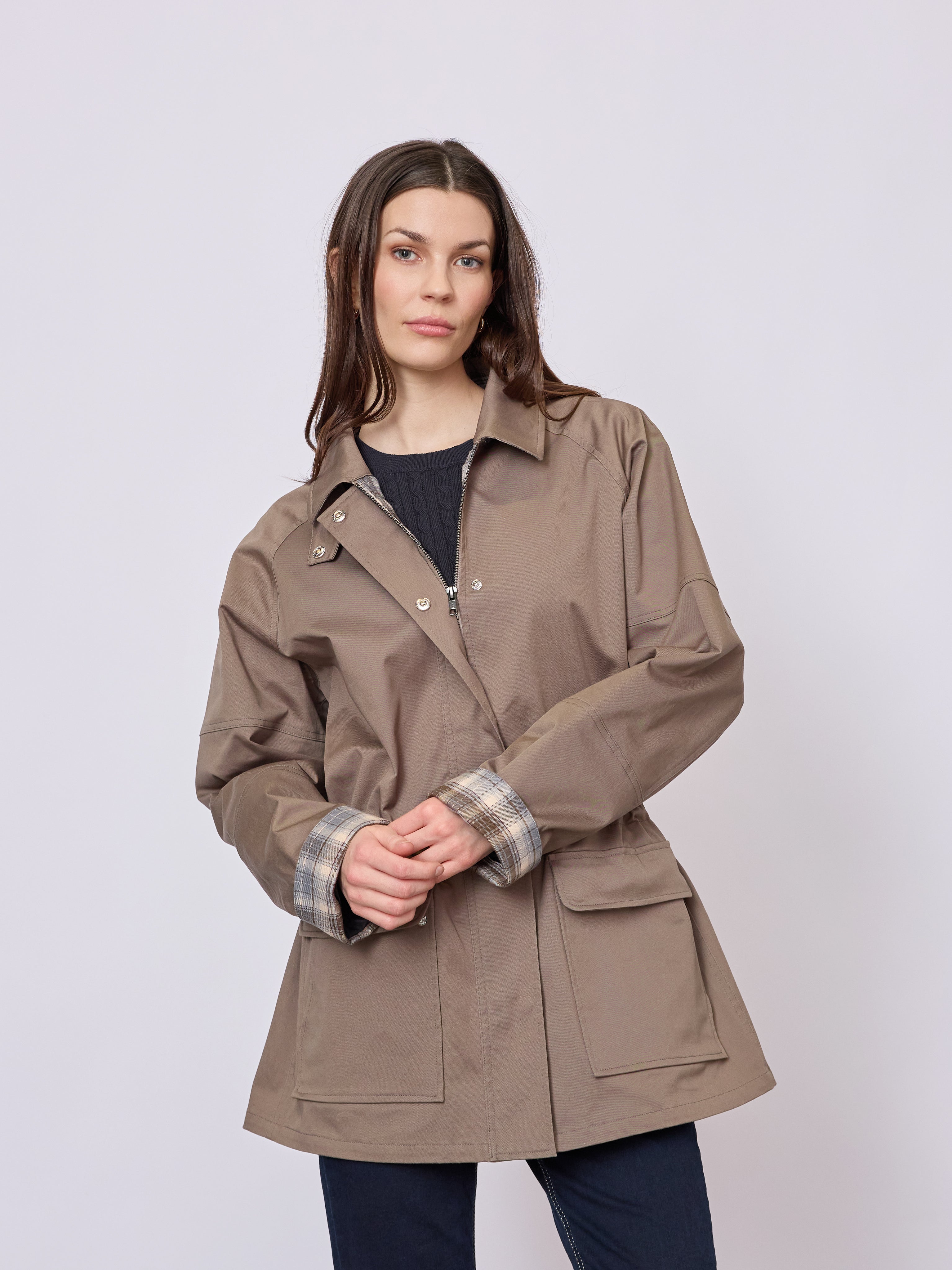 Klassisk damejakke i bomuldsblanding med let stretch og en feminin, funktionel silhuet. Taljen kan justeres for en behagelig pasform, velegnet til overgangsperioder.