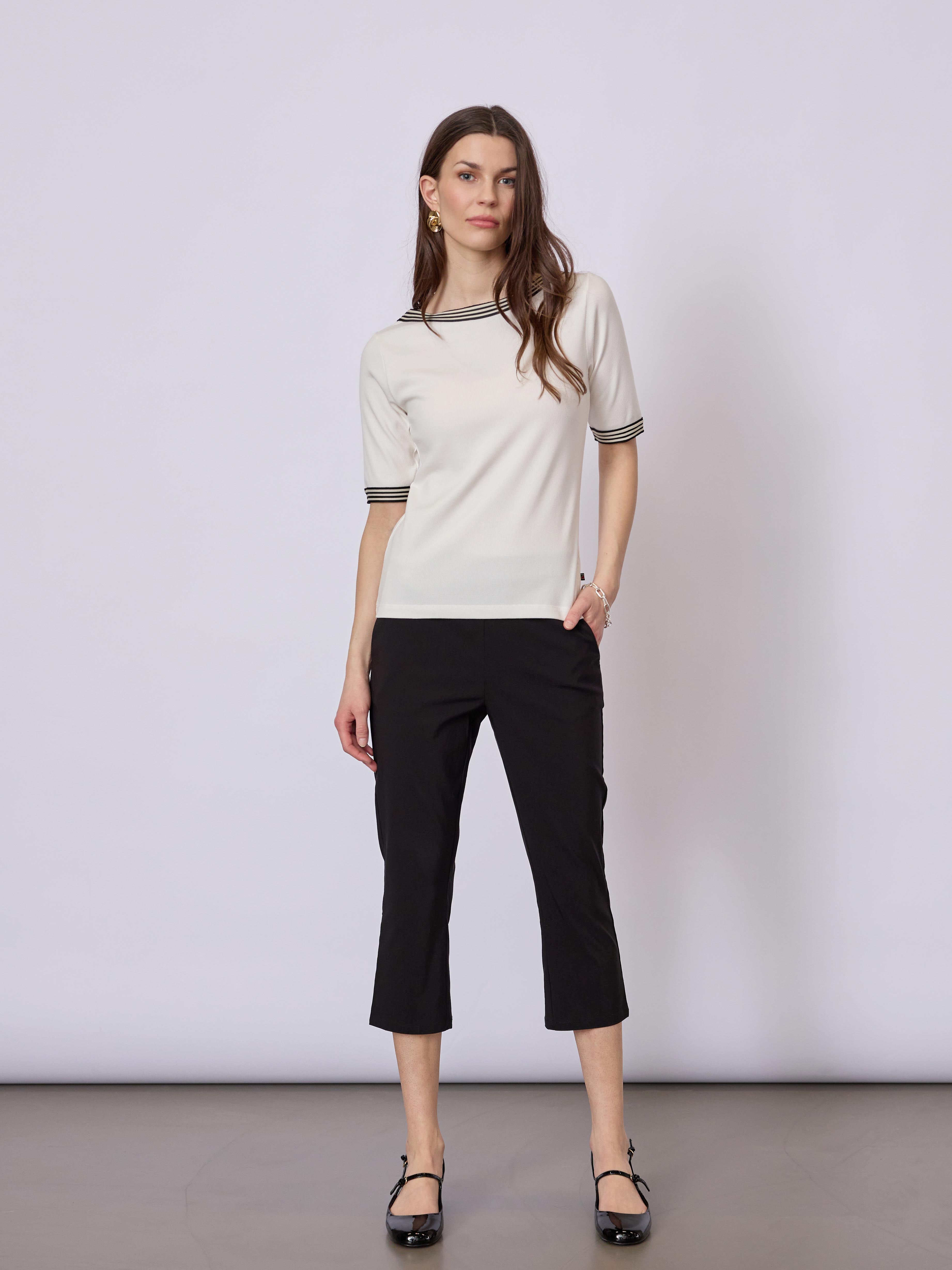 Elegant og komfortabel T-shirt med fine kontrastdetaljer, fremstillet i en blød og strækbar kvalitet. En alsidig T-shirt, der fungerer både til hverdag og mere pæne anledninger.
